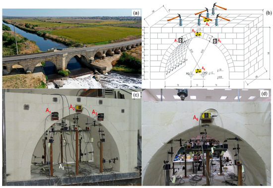To assess the applicability and adaptability of the proposed methodology to real engineering structures, data collected from an experimental study conducted at the Materials Lab of the Civil Engineering Department at Istanbul Technical University is presented. The test specimen comprises a ¼-scale model of a specific span of the Uzunköprü bridge, a historical Ottoman bridge, dating back to the 15th Century, located over the Ergene River in Edirne, Turkey. The model features an arch ring with a span of 1.73 m and a rise of 0.94 m. It has an overall width of 1.4 m, encompassing both the spandrel walls and the fill. A reinforced concrete slab, 10 cm thick, with plan dimensions of 3.20 × 1.55 m, served as the foundation for the bridge model. Figure 5a,b display the photo of the bridge and the sketch of the test specimen.