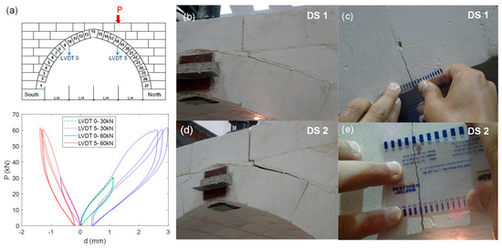 (a) Load-displacement curves, (b) Initiation of the hinge, (c) cracking around on the wall and extrados during loading up to 30 kN (DS 1), (d) plastic hinge formation, (e) propagation of cracks during loading up to 60 kN (DS 2).