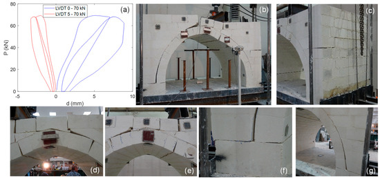 (a) Load-displacement curves, (b) collapse at 70 kN, (c) side view, (d–e) keystone: frontside, (d), backside, (e), (f–g) springing point: frontside (f), backside (g).