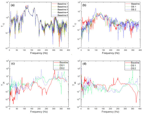 Damage detection is based on tracking the difference in amplitudes of the transmissibility functions selected as the DSFs. The selected transmissibility functions, or more specifically, the sum of the amplitudes of the transmissibility over the frequency range of interest, are tracked for detecting anomalies in the data patterns as an indication of structural changes. Hence, DSF is expressed as: