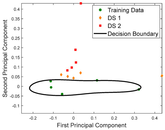 Since the number of training data was limited to five, OCSVM was preferred over the other learning models, and classification task was completed with the trained OCSVM. With the DSFs extracted from the impact tests that were conducted after loading the specimen to 30 kN (DS 1) and 60 kN (DS 2), test data was classified as ‘not-belonging’ to the trained state in both cases. To visualize this damage decision with OCSVM, DSFs were projected onto 2-D space using principal component analysis (PCA). Figure 9 presents the principal components of the training data, test data, and the decision boundary. As shown in this 2-D representation, even at a loading level of up to 30 kN (DS 1), the proposed method successfully detected damage.