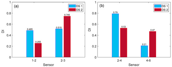 Using these identified modes, flexibility matrices for both the undamaged and damaged states were synthesized, and the damage indices were computed based on the relative changes in the diagonal entries of the flexibility matrix, following the same procedure as in the numerical case. Figure 13 presents the computed damage indices for these cases. Based on this figure, the flexibility-based approach initially misidentifies the region around sensor 1 as the potential damage location, leading to a mislocalization in the first damage case (DS1). However, with an increased load and progression of damage in DS2, the method improves and correctly locates the damage around sensor 2.