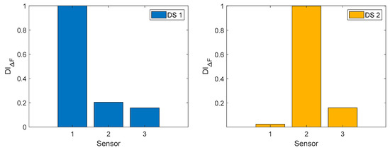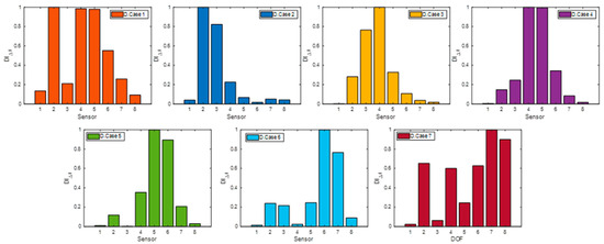 Following the formulation given in Equation (13), the flexibility matrix was computed, and the relative changes in its diagonal entries were calculated for all damage cases. These values were then normalized with respect to the largest value to obtain the damage index, denoted as . The resulting damage indices for all damage cases are presented in Figure 11.