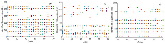 Stabilization diagram for the identified natural frequencies from impact excitation at A1: (a) Baseline, (b) DS 1, (c) DS 2. Each color represents the set of frequency values obtained for a certain system order.