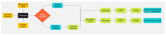 The signal-processing chain is shown in Figure 2, which follows [23] with some adaptions to certain characteristics of our dataset. A pipeline without decimation was implemented in this work, which attempted to retain more signals and aggregate frequency information. The signal was captured by a hydrophone with intrinsic noise from the environment and equipment. Signals could be recorded in either mono or 2-channel stereo. The average of the channels was computed for the stereo signals. In the first pipeline, the signals were decimated by a factor of four, which reduced the time resolution. The signals were then converted to a lower sampling rate while preserving their main characteristics. In the second pipeline, the signals were not decimated. This approach was used to evaluate the impact of decimation on a smaller resolution in the spectrum. The acoustic signature was recorded in a 22 kHz audio format and then reduced to 5.5 kHz or recorded at 16 kHz and reduced to 4 kHz by decimation.