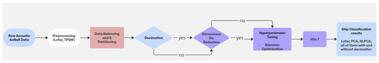 The transformations performed in the signals from the bank of runs were implemented in Python to generate the DataFrame TPSW. The resulting DataFrame had 480 entries, and it was balanced to include 40 entries for each of the 12 classes when decimation was present. When decimation was not performed, 5760 entries were used, with 480 entries for each vessel. Each input was represented by a 2048-point vector derived from the fast Fourier transformed magnitude, which was whitened using the TPSW technique. This generated the DataFrame TPSW, which served as an appropriate input for the ML algorithms. Their results were placed in a DataFrame, which is defined as a set of two-dimensional tabular data that are changeable in size and potentially heterogeneous, which allows for flexibility. It has a data structure containing labeled axes, rows, and columns, where arithmetic operations are aligned on row and column labels.