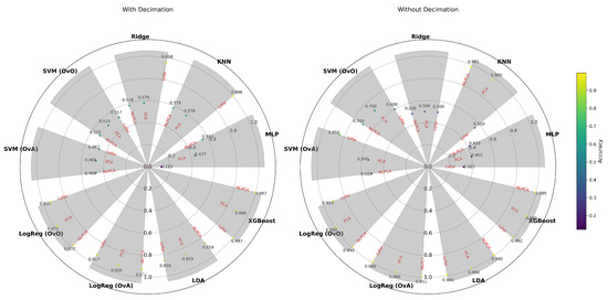 The results with decimation yielded higher-performance models, such as XGBoost, ridge, and logistic regression, which showed the highest accuracies across the preprocessing methods, where they achieved over 96% accuracy. On the other hand, lower-performance models, such as SVM and MLP, achieved accuracies below 60%. These models generally showed a higher standard deviation with decimation, indicating less repeatability in the performances across different runs.