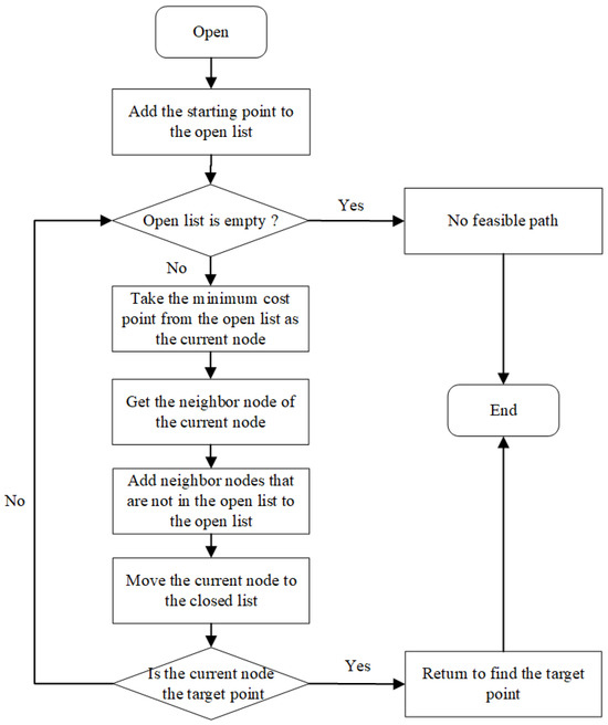 The search flow chart of the A* algorithm is shown in Figure 1. First, create a list of paths to store the path from the starting point to the target point. During the search process, maintain an open list and a closed list to store the nodes to be extended and the extended nodes. Each time, the node with the smallest total cost in the open list is selected as the current node of the search and moved into the closed list. Then, determine whether there are obstacles in the current node. If there are no obstacles, update the open list and the closed list. And judge whether the current node is the target point, if so, the feasible path is searched out.