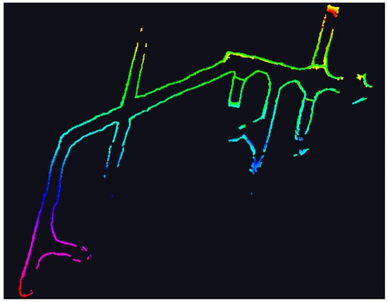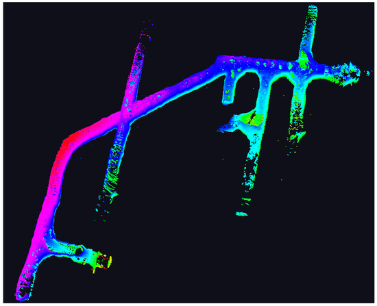 Global path planning is conducted based on a complete understanding of the environment. Accordingly, this paper acquired the three-dimensional point cloud data of an underground roadway at a working face of China Shanxi Zijin Mining Co., Ltd., as shown in Figure 2. The color map encodes point-cloud elevation, transitioning from red at the lowest points through orange, yellow, green, cyan, blue, to magenta at the highest points.
