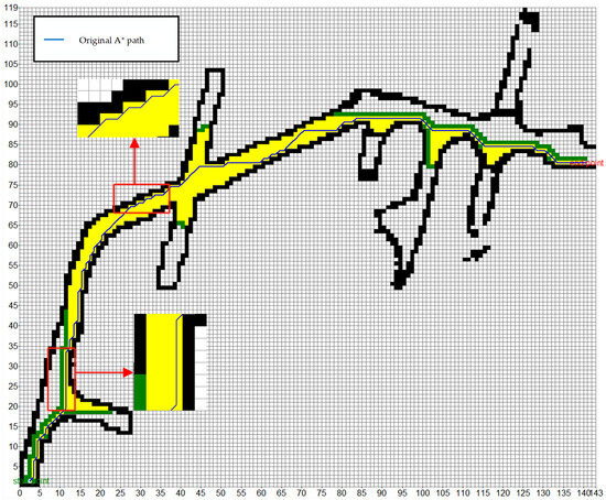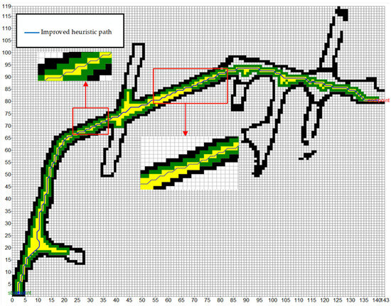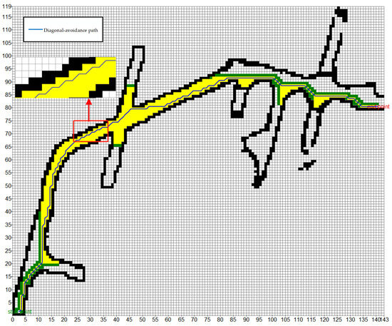 At the same time, considering the diversity of the width of the underground roadway, in order to ensure the safety of the path planning, the ideal path should be set in the central area of the roadway. However, the traditional heuristic function often tends to the edge of the roadway when planning the path, which undoubtedly increases the potential collision risk. Therefore, it is expected that the path planning algorithm can be more inclined to the area with a larger roadway width or the center of the roadway when selecting the path, so as to effectively reduce the possibility of collisions and improve the overall safety and reliability of the path. We expect that by optimizing the heuristic function, the performance of the A* algorithm in roadway path planning can be significantly improved. The expected effect is shown in Figure 6.