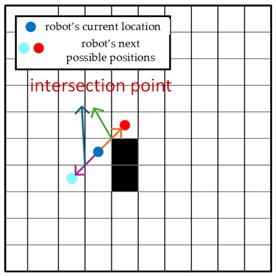 When the robot moves diagonally, it will directly cross the corner of the obstacle, which violates the safety requirements of the actual movement of the robot, which may lead to collision accidents. In order to solve this problem, the concept of the intersection point is introduced. The intersection point specifically refers to the key points that the robot must pass through when crossing the grid during oblique diagonal motion, as shown in Figure 5. The arrow points to an intersection.