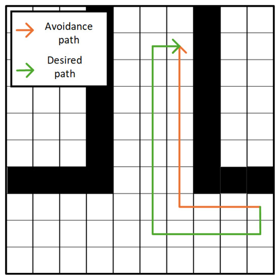 Taking Figure 5 as an example, if the blue node tries to move diagonally to the red node, the diagonal grid unit in the other direction adjacent to the intersection should be checked. If an obstacle is detected in the grid unit on the right side of the blue node, it is determined that the orange path is impassable and the path needs to be replanned. On the contrary, if the blue node moves to the light blue node, the inspection results show that the diagonal grid units in the other direction adjacent to the intersection have no obstacles, then the purple path can be determined as a passable path.