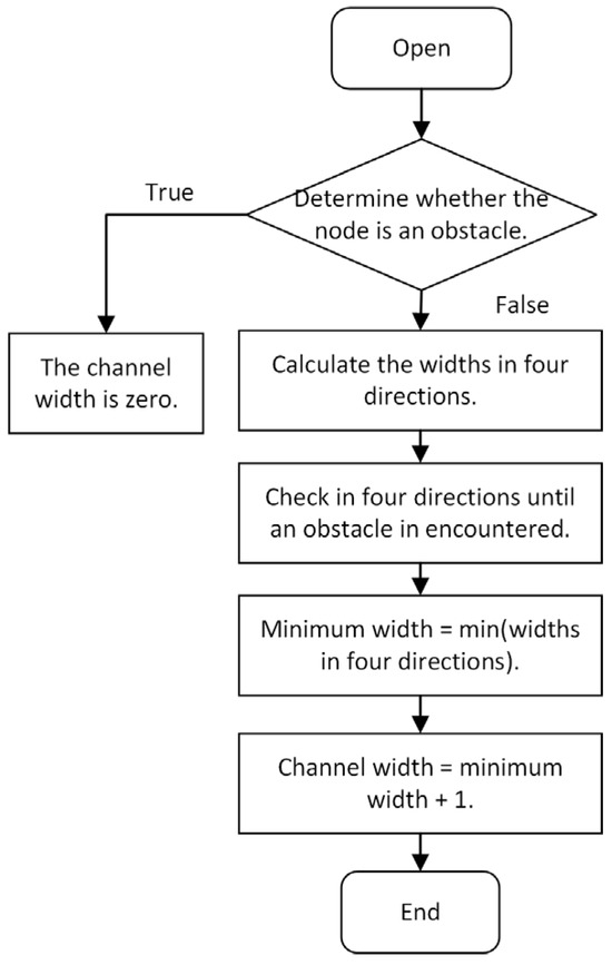 Therefore, in order to achieve the desired path planning effect, the roadway width is integrated into the heuristic function as a key factor. The premise of this scheme is that the width information of the roadway where the current node is located can be accurately obtained from the grid map. The process of calculating roadway width information is shown in Figure 7.