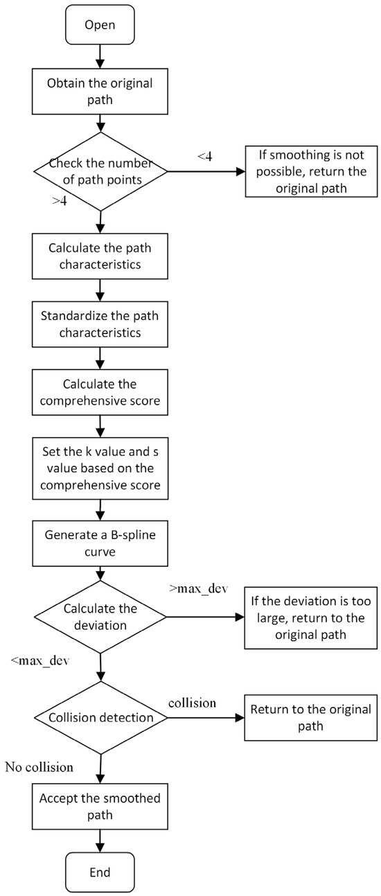At the same time, if fixed and are used, then there will be obvious limitations in the diversification path. The path may be too smooth when the path is simple, resulting in deviation and loss of key features; when the path is complex, the smoothness is insufficient, and the turning and fluctuation cannot be effectively eliminated, which affects the coherence and execution efficiency of the path. Therefore, it is necessary to design an adaptive B-spline curve smoothing strategy to dynamically adjust the parameters according to the complexity and characteristics of the path, so that the path can achieve the best smoothing effect in different scenarios. When the path complexity is high, higher parameters are selected to generate smoother and more coherent curves and reduce the turning frequency. When the path complexity is low, the lower parameters are selected to avoid the path deviation caused by excessive smoothing.