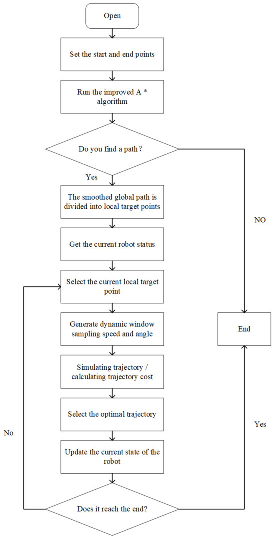 This paper combines the improved A* algorithm with the improved DWA algorithm. The adaptive A* algorithm is used to obtain the smoothed global path, which is divided into multiple local target points. In the control cycle, the DWA uses the improved evaluation function to select the best trajectory according to the current local target point, the current state of the robot, and the environment. Once close to the current local target point. DWA will switch to the next target point until it reaches the end point. The specific process is shown in Figure 9.