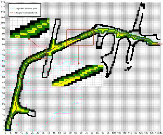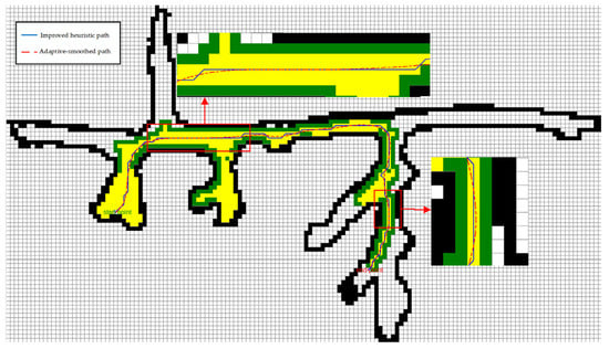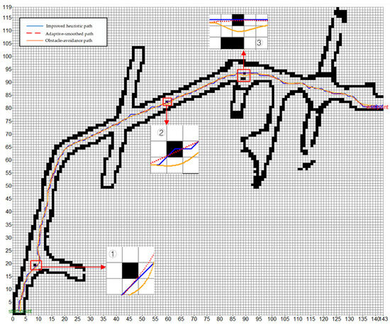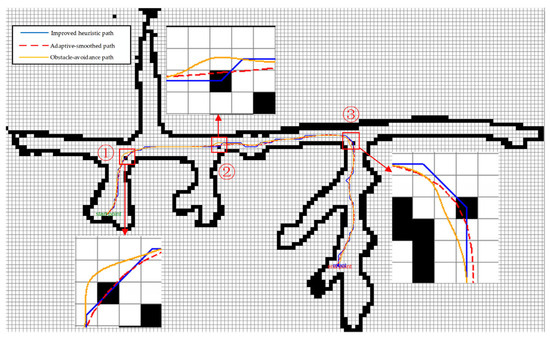 In Section 2.4, a method of adaptively selecting the order and smoothing factor of B-spline curve smoothing according to the characteristics of the global path planning route is introduced. After many experiments, the maximum offset is set to 3.0, and the weights are respectively , , , and . Adaptive selection of is 3, and is 10.91. The experiment results are shown in Figure 12.