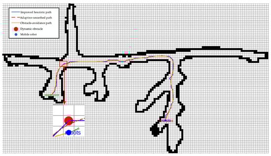 Figure 16 substantiates the robustness of the integrated planning framework when confronted with newly introduced static obstacles. Although the global route is pre-computed, the mobile platform autonomously perceives emergent impediments and, at the three representative loci (①–③), performs on-the-fly local replanning to negotiate collision-free detours.