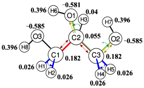 Calculated atomic charges of the glycerol molecule with permission (image taken from and modified after [41], see reference for details of the calculation). Dashed and dotted colored lines indicate the selected interatomic bond vibrations with the respectively involved bonds also highlighted: C-C stretching (red), C-O stretching (yellow), H-C-H bending (blue), and O-C-C-O torsion (green); the respectively colored arrows visualize the type of bond vibration, i.e., stretching (straight), bending or torsion (curved). The corresponding force fields are listed in Table 3.