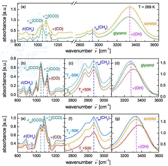IR-spectra of (a) sorbitol and glycerol both at a temperature of 269 K in a wide spectral range, and close-ups of the spectral regions of (b,e) the (C-O) stretching vibration, (c,f) the (C-H) stretching vibration, and (d,g) the (O-H) stretching vibration at their respective and further temperatures as indicated for glycerol and sorbitol, respectively. The data are taken from [42].