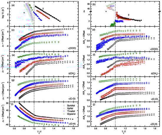 -scaled temperature dependence of (a) the mean relaxation times and (b) the respective relaxation strength of the - and -relaxation obtained from BDS measurements, as well as (c,e,g,i) the relative position and (d,f,h,j) area of select IR absorption bands of several polyalcohols as indicated: (c,d) stretching vibration of the C-C-O bond (CCO); (e,f) scissoring vibration of the CH2 bond (CH2); (g,h) stretching vibration of the C-O bond (CO); (i,j) stretching vibration of the O-H bond (OH). Taken from [28] with permission.