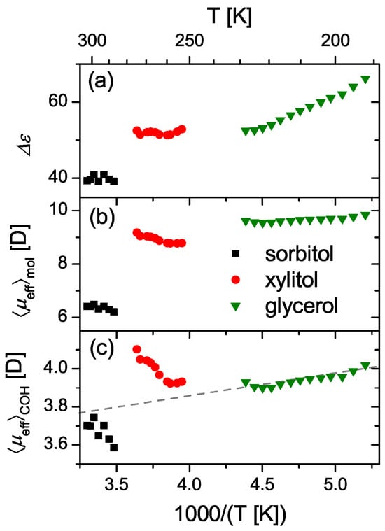 Temperature dependence of (a) the dielectric relaxation strength of the -relaxation, as well as the underlying microscopic effective dipole moment, based on the assumption that the fluctuating moiety is (b) the whole molecule , or (c) the COH unit , for several polyalcohols as indicated. The dashed line in (c) is a guide to the eye. The data are taken from [28].
