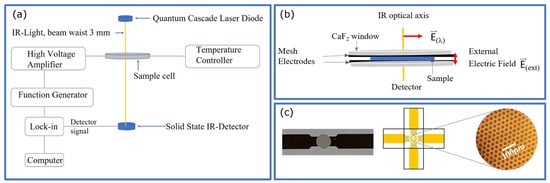 with the external electrical field . To measure this effect, the technical difficulty lies in the fact that conventional metal electrodes (as used in dielectric spectroscopy) are not transparent in the IR-spectral range. However, employing evaporated mesh structures [56] or nanometric (∼6 nm) sputtered platinum layers, it is possible to find a compromise between the requirement of sufficient IR transparency and the need to apply high electric fields of typically to V/cm. As an IR source, quantum cascade laser diodes or tunable IR lasers can be used (Figure 6). The sample material, having a thickness of a few μm, is contained between two mesh electrodes in a crossed arrangement.