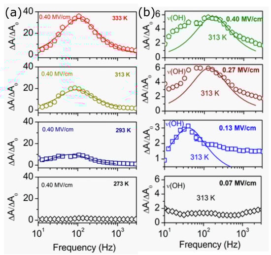 OPS-spectra for the O-H moiety (measured for the stretching vibration (O-H) at nm). (a) describes the modulation of the transmitted detector signal in response to the frequency of the external electrical field at a fixed temperature of 313 K for decreasing field strengths as indicated. is the noise level measured at the detector if no external electric field is applied. (b) is similar to (a) but for varying temperatures at fixed field strength as indicated. The data are taken from [56].