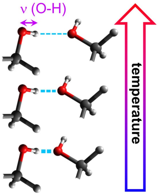 Scheme of the inter-molecular H-bond at varying temperatures demonstrating the increased constraint of the angular orientation of the H-O unit at lower temperatures due to the growing proximity of the H-bond acceptor.
