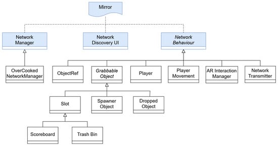 - Network Manager, which uses the Mirror library, is in charge of exchanging messages among the clients and the server, while it is also responsible for keeping all the objects synchronized.