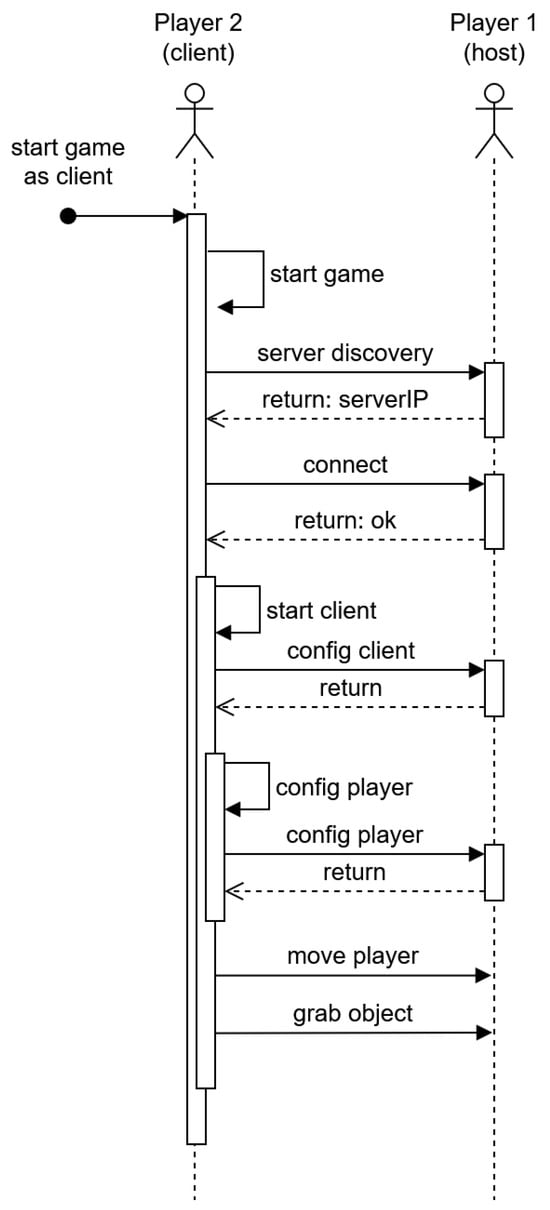 - A person (Player 2) starts the application and selects the menu button to connect as a client. This is the only action performed by Player 2, the rest of the process is executed automatically by the system.