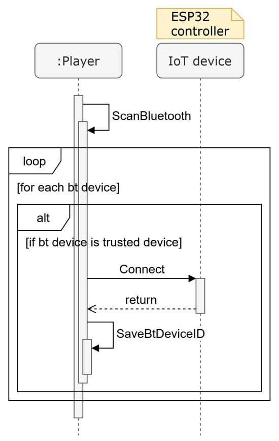 To facilitate the integration with heterogeneous IoT devices while minimizing manual configuration, an allowlist mechanism was used during the Bluetooth auto-discovery process. This allows us to apply a flexible naming convention in which compatible devices are recognized by their broadcast device name, following the pattern “APP_NAME_<device-id>”. This approach allows the application to dynamically detect devices intended for this MR system without hardcoding any Universally Unique Identifier (UUID) or device identifiers, thereby improving scalability. In addition, a locally stored configurable list of trusted devices could be added. This list would contain accepted name prefixes, and only devices whose device name includes one of these prefixes in their Bluetooth advertisement beacons are considered eligible for connection. This system would provide an extra layer of filtering to ensure that only validated and expected devices could interact with the application.