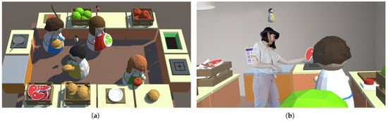 The developed game consists of a collaborative experience in which users work together in a fast-food restaurant in a similar way to games like Overcooked [23]. Players in multiple remote locations need to collaborate in real-time to face challenges such as preparing salads or hamburgers, making sure these are delivered on time while not burning the kitchen in the process. Moreover, in order to achieve more dynamic experiences, an Internet of Things (IoT) module has also been designed to allow the application to interact with real-world objects [24]. In this particular use case scenario, an IoT button is used to activate a fire extinguisher in the event that a frying pan bursts into flames.