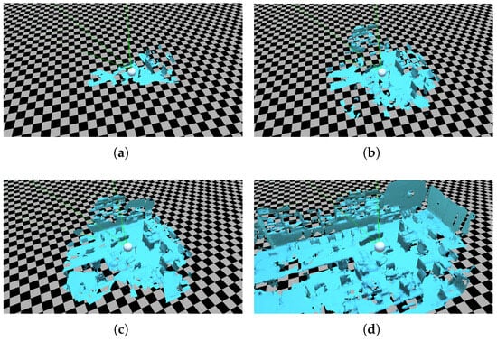 Three-dimensional meshes of the spatial mappings captured by the HoloLens for each experiment: (a) Small anchor. (b) Medium anchor. (c) Big anchor. (d) Room-sized anchor.