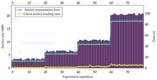 The obtained results were analyzed and are summarized in Table 2, where the average times and standard deviations are detailed for each anchor size scenario. For the smallest anchor size (3.0 MB), transmission times ranged between 12.69 and 12.84 s, where the anchor loading time remained below 1 s in most cases. In the next scenarios, as anchor complexity increased, both the transmission and loading times also rose. In the case of medium-sized anchors (6.0 MB), transmission times were required to be from 25.62 to 25.74 s and between 1.39 and 2.13 s to be loaded. For an anchor of 10.1 MB, transmission times ranged between 43.36 and 43.63 s, with loading times from 2.36 to 3.38 s. Finally, room-sized anchors (20.1 MB) required the highest performance demands, with transmission times ranging between 85.57 and 87.18 s and loading times exceeding 4.74 s and even reaching 6.75 s.