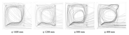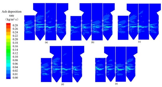 - Reducing the tangential circle diameter can alleviate the ash deposition on the wall. With the decrease in the tangential circle diameter, the ash deposition changed from a zonal distribution to a point-like distribution, and the ash deposition rate and distribution area both decreased significantly. When the tangential circle diameter was reduced to 400 mm, the average ash deposition rate on the wall was reduced to 0.00207 kg/(m2·s), which was 37.6% lower than the original condition. However, the influence of reducing the circumferential diameter on the combustion efficiency of the boiler needs to be further evaluated.