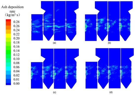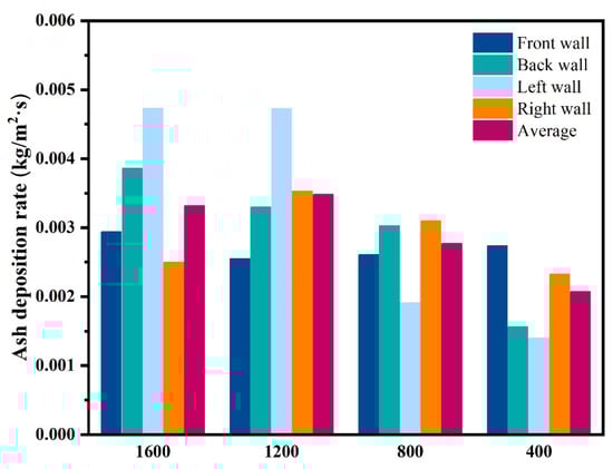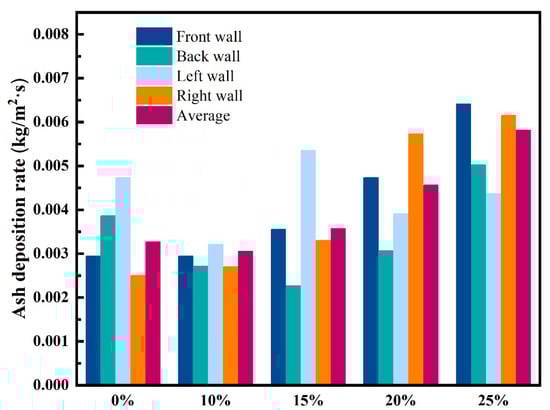 - With the increase in the mixing ratio, the condition of wall ash deposition deteriorated gradually, and the average ash deposition rate increased significantly. The average ash deposition rate on the wall was 0.00327 kg/(m2·s) without mixing, and the average ash yield was 0.00581 kg/(m2·s) when the mixing ratio was 25%, which was 77.6% higher than that without mixing.