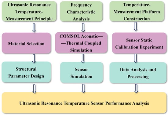 By integrating the magnetostrictive effect with a resonant sensor, the resonant sensing element can be coupled with the magnetostrictive transducer to design an optimized ultrasonic-guided-wave resonant temperature sensor. A high-voltage pulse signal excites the longitudinal mode [] of the ultrasonic-guided wave, causing a sound wave to propagate within the sensor. The resonator’s frequency [] is influenced by both material properties and environmental parameters, causing its natural frequency to vary with temperature. Temperature can be inferred by monitoring these frequency variations, enabling ultrasonic resonance-based temperature measurement in extreme environments. Ultrasonic measurement technology offers distinct advantages over traditional techniques for high-temperature applications, facilitating its widespread industrial application. To clearly illustrate the design process of the ultrasonic resonant temperature sensor adopted in this study, a schematic diagram of the system is presented, as shown in Figure 1. This diagram encompasses key steps including structural design, finite element-simulation analysis, device fabrication, and experimental testing, systematically reflecting the entire research and development process.