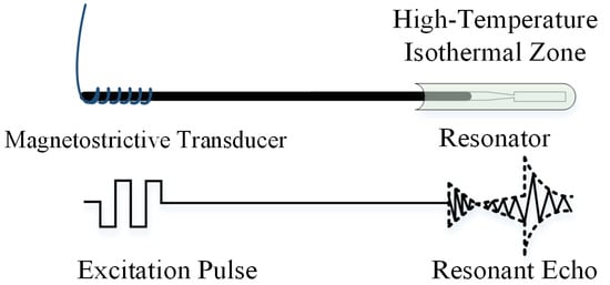 When ultrasonic waves propagate in a waveguide rod, the change in temperature is actually detected by measuring the resonant frequency. The resonator, as the main temperature-sensitive component, is made of materials whose acoustic properties (e.g., speed of sound and modulus of elasticity) change with temperature, which in turn leads to a change in resonant frequency. These principles of ultrasonic guided wave resonance are illustrated in Figure 2.