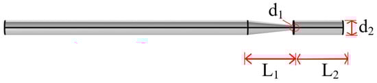 In the design of resonant ultrasonic temperature sensors, the waveguide rod and the sensitive area section are integrated structures, which makes the relationship between the resonant frequency and the temperature different when the acoustic wave is transmitted to the sensitive elements with different structural parameters. In order to achieve optimized design and efficient processing, a half-wavelength resonator consisting of a combination of cones and cylinders was chosen in this study, and its structure is shown in Figure 3.