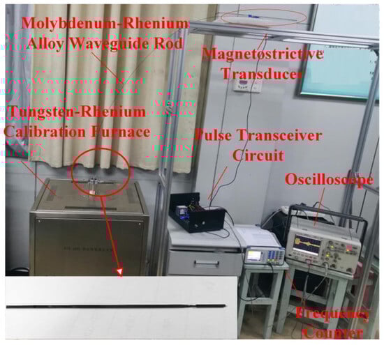 The ultrasonic resonant temperature-sensing system consists of a molybdenum–rhenium alloy waveguide rod, a magnetostrictive transducer, an oscilloscope, a resonator (serving as the sensitive element), a frequency meter, a tungsten–rhenium calibration furnace, and a pulse transceiver circuit. The schematic diagram of the constructed temperature measurement experimental system is shown in Figure 4. The machined ultrasonic resonator coupled with the magnetostrictive transducer was placed in the constant temperature area of the calibration furnace, and the temperature measurement system was adjusted by an oscilloscope and a frequency meter so that the acoustic wave transmitted inside it could generate resonance. The magnetostrictive transducer transmitted the acoustic signal and collected the ultrasonic resonance echo signal to record the resonance frequency at room temperature.