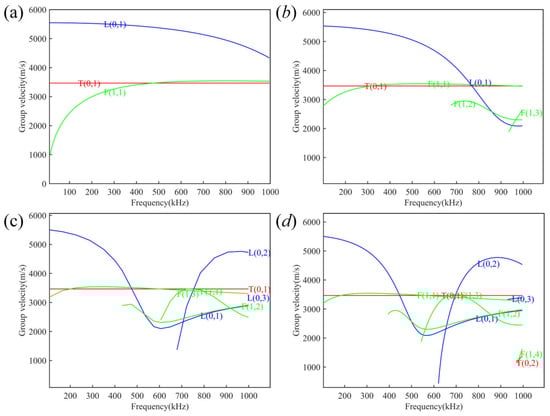 Group velocity dispersion curves for diameters at (a) 1 mm; (b) 2 mm; (c) 3 mm; (d) 4 mm.