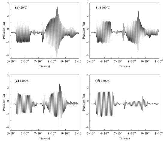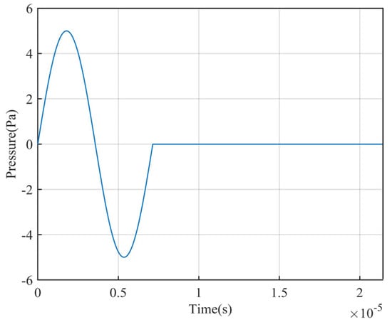 The propagation process of ultrasonic waves in the waveguide rod over time was simulated by simulating the 3D model several times to ensure its normal operation. In order to more accurately simulate the propagation characteristics of the acoustic wave in the temperature field and in terms of the thermal effect it produces, the three modules of pressure acoustics, solid mechanics, and solid heat transfer were selected, and the boundary conditions and material properties were set, as shown in Table 1, so as to realize the multi-physics field coupling and solve the partial differential equations. In the solution process, in order to improve the simulation effect, the acoustic pressure was applied at the excitation end of the waveguide rod to simulate the generation of ultrasonic signals, and the functional relationship is shown in Equation (12); the waveform of its excitation function is shown in Figure 6.