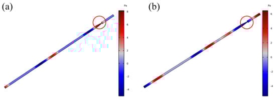 The simulation study of COMSOL-based thermometry model requires meshing, and the accuracy of its simulation results mainly depends on the mesh density or excitation frequency of the model. Therefore, the grid density of the resonance region was set to be less than 1/8 of the excitation wavelength. When the frequency was set to 140 kHz, the length of the resonator was 19 mm, and in respect of when the relevant physical properties of the molybdenum–rhenium alloy material were input, the sound-pressure distribution of the sound wave propagating in the resonator obtained from the simulation is shown in Figure 5 below. The results show that when the sound wave propagates to the resonator region, part of the wave is reflected and the other part continues to propagate forward along the waveguide rod. The interference between the reflected wave and the forward propagating wave results in a stable sound-pressure distribution in the resonator, which leads to the resonance phenomenon. As the sound wave propagates into the resonance region, the sound pressure value increases significantly (Figure 7a). Part of the wave is reflected (Figure 7b), and the sound pressure energy is attenuated during the propagation process. When the sound wave interacts with the resonance region, the reflection and attenuation phenomena become obvious. During the simulation, the acoustic wave propagation of the molybdenum–rhenium waveguide rod is affected by the material parameters, pressure acoustics, boundary conditions, and other factors.