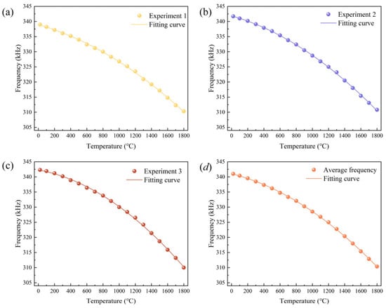 The temperature-resonant frequency relationship curves obtained by polynomial fitting during the temperature increase/decrease process are shown in Figure 9 and Figure 10. The experiments show that when the molybdenum–rhenium alloy is used as the sensitive element for temperature measurement, a nonlinear relationship between frequency and temperature is presented. When the temperature changes in the range of room temperature to 1800 °C, the physical properties of the waveguide rods change accordingly, affecting the acoustic-wave-propagation speed. As the temperature increases, the propagation speed of sound waves in the medium gradually slows down, resulting in a lower resonator frequency. The average resonance frequency at room temperature is 341.8 kHz when warming up, while it decreases to 310.37 kHz at 1800 °C; the average resonance frequency at 1800 °C is 309 kHz when cooling down. Based on the relationship between the change of the resonance frequency and the change of the temperature, the average sensitivities are calculated to be 17.66 Hz/°C and 18.43 Hz/°C, respectively.