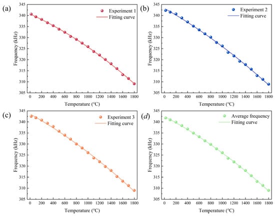 After completing the construction of the temperature measurement system, the ultrasonic resonant temperature sensor with the same parameters as the simulation model was prepared, and its design parameters are shown in Table 2 below. In order to verify the performance, the assembled sensor was placed in the calibration furnace for static calibration experiments []. Before the calibration experiment, the temperature range of the calibration furnace was set from room temperature to 1800 °C, and the temperature was kept for 5–10 min after every 100 °C rise to make sure that the temperature field in the furnace was uniform, that the sensor maintained a stable working state, and that the temperature–frequency relationship curve of the sensor was obtained.