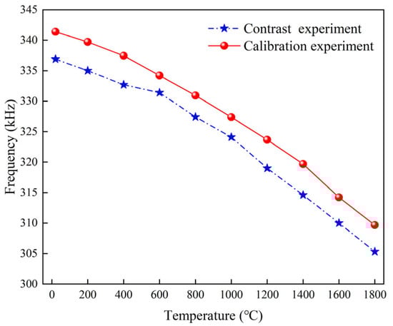 After completing the static calibration experiment, in order to verify the temperature-measurement accuracy and stability of the ultrasonic resonant temperature sensor in different high-temperature environments, the sensor was placed in another high-temperature furnace for contrast testing, and the test results are shown in Figure 11. The average resonance frequency measured in the calibration experiment is 309.68 kHz, while the frequency measured in the contrast experiment is 305.3 kHz. The difference in resonance frequency at the same temperature point is (3.28–5.08) kHz in the temperature range from room temperature to 1800 °C. The reason for this deviation may be that the surface of the sensor material undergoes different degrees of oxidation in different test environments, resulting in different degrees of changes in the physical properties of the material, affecting the accuracy of the resonance frequency test. Despite the error, the sensor still shows good performance in the whole temperature range, which verifies the feasibility of temperature monitoring in high-temperature environments and meets the actual temperature-measurement requirements [].