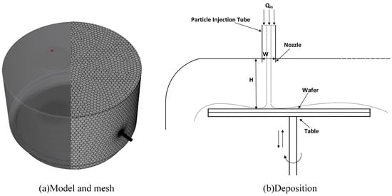 As shown in Figure 1, the model grid and deposition schematic of the chamber are presented. The deposition chamber has a bottom diameter of 200 mm and a height of 120 mm, making it compatible with the standard 50 mm wafer size. In this study, particle motion and deposition distribution on the wafer wall were analyzed by modifying the chamber structure and adjusting particle properties. To achieve uniform deposition, the effects of nozzle diameter, nozzle-to-wafer distance, chamber volume, rotational speed, and particle diameter were investigated.