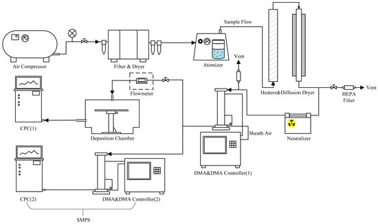 Figure 2 illustrates the particle generation–deposition system. A diluted polystyrene latex (PSL) suspension was prepared by mixing a PSL standard suspension (1:2000 mass ratio) with deionized water. This mixture was used to generate monodisperse polystyrene aerosol particles. The suspension was atomized using a pneumatic atomization generator to produce droplets containing PSL particles. These droplets were subsequently dried using a heating and diffusion dryer to remove moisture, resulting in solid aerosol particles. The aerosol was then charge-neutralized and classified by a differential mobility classifier (DMC) to obtain a monodisperse sample with the desired particle size. The size distribution was measured by a scanning mobility particle sizer (SMPS), and a portion of the aerosol flow was directed into the deposition chamber, which was connected to a condensation particle counter (CPC) for real-time concentration monitoring.