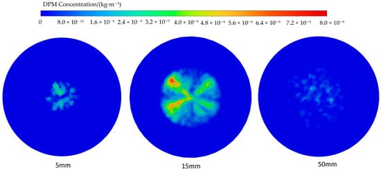 Compared to the nozzle-to-wafer distances of 5 mm and 50 mm, a height of 15 mm yields the best deposition uniformity, with a relatively high DPM concentration. Simulation results show that at this height, aerosol streamlines exhibit optimal adherence to the wafer surface, achieving a balance between inertial and diffusive forces. This balance leads to significant advantages in both deposition efficiency and concentration distribution. Based on a comprehensive comparison of the simulation results at different nozzle-to-wafer distances, 15 mm is identified as the optimal nozzle-to-wafer distance.