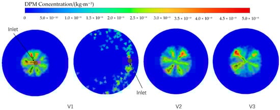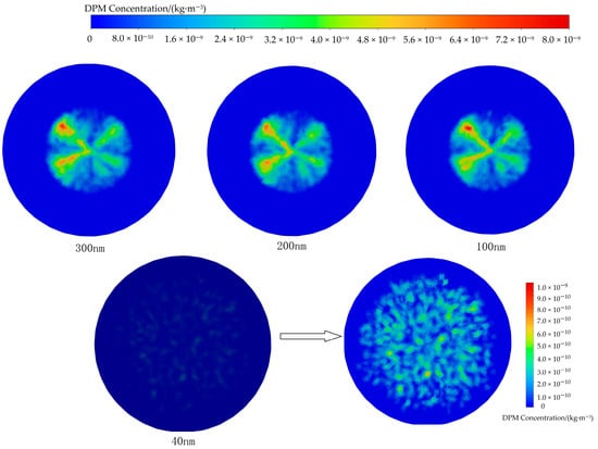 In this study, the particle size range was 70 nm to 300 nm, with the DPM phase set as monodisperse particles. In the Lagrangian model, particles were simplified as mass-bearing points with no volume, and particle–particle interactions were neglected. Since the volume fraction remained below 10% throughout the calculations, particle size variations did not significantly affect the flow field but influenced the transport and distribution of the discrete phase within the flow.